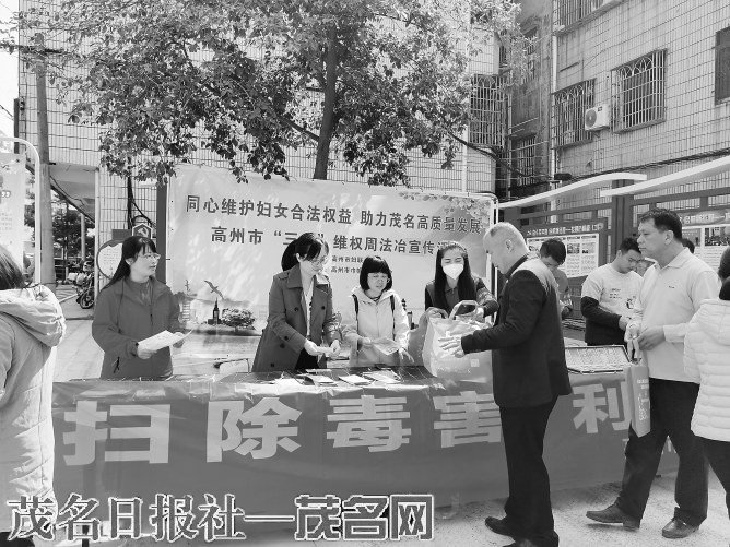 本报讯近日,高州荷花镇妇联、综治办、禁毒办联合高州妇联开展高州市“三八”维权周法治宣传活动,宣传内容包括妇女维权、平安建设、反邪教、禁毒、防范电信诈骗等。