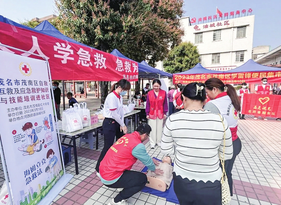 本报讯 为增强社区居民忧患意识、风险意识、安全意识,提高居民面对突发事件和意外伤害事故中的应急避险和自救互救能力,近日,茂南区河西街道退役军人服务站结合“学雷锋活动月”,联合茂名市茂南区红十字会、河西街道油城社区退役军人好心志愿服务队开展自救互救及应急救护知识技能培训进社区志愿活动。