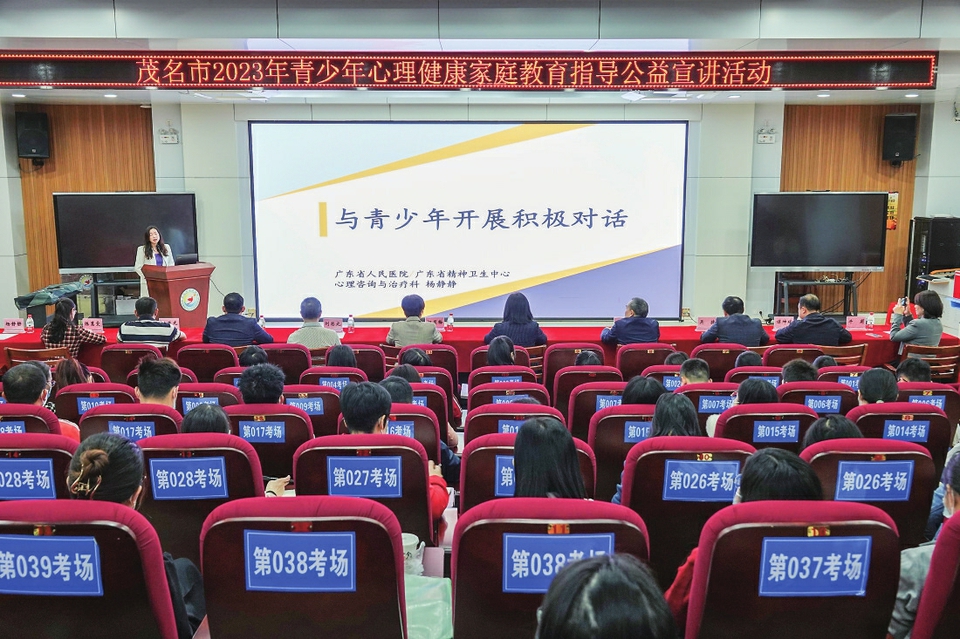 本报讯 昨日上午,茂名市2023年青少年心理健康家庭教育指导公益宣讲首场活动在市育才学校正式开讲(如右图),全市教育系统教师以及家长通过线上线下收听收看宣讲。