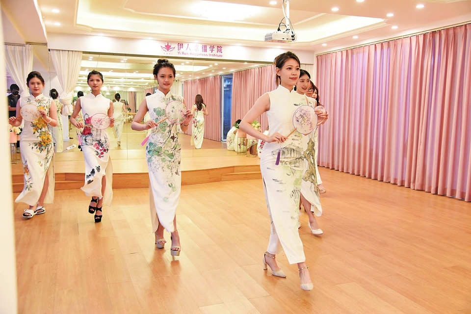 下午,选手们换上了定制的荔枝旗袍服,手握圆形扇子,面带浅浅微笑,迈着轻盈婀娜的步伐,在导演的指导下一遍又一遍对着舞蹈室的镜子练习旗袍走秀,莲步轻移,暗香流韵,举手投足之间,充分展示了中国女性的端庄优雅、温婉含蓄之美,呈现了一种优美的韵律感。