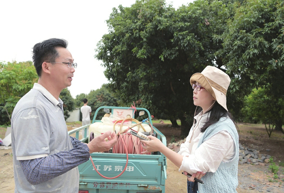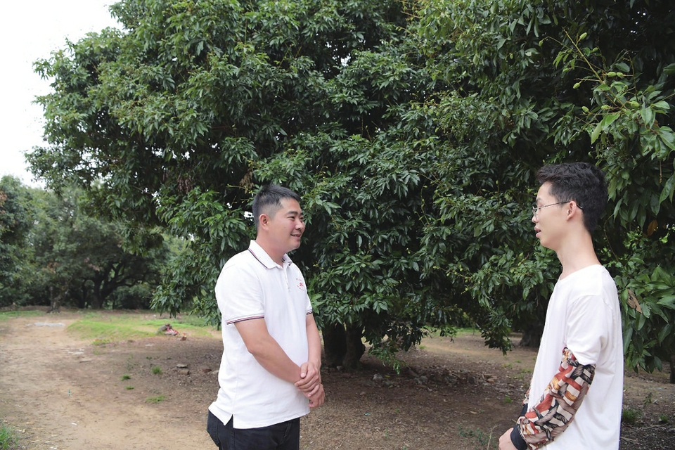 郁郁葱葱的荔枝树下,何清(左)正在与果农交流种植技术经验。