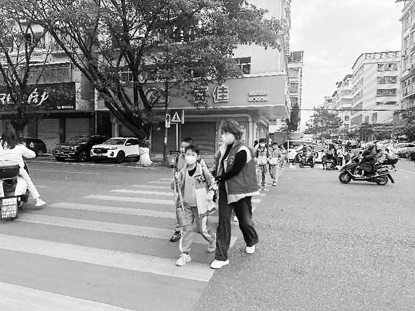 本报讯“迟日江山丽,春风花草香。”日前早上7点整,信宜市田家炳小学门前的中兴大街一群穿着红马甲志愿服的志愿者正在护送孩子们过马路,全力护航孩子们的上学安全。他们是由学校家长组成的“护学岗”志愿者。