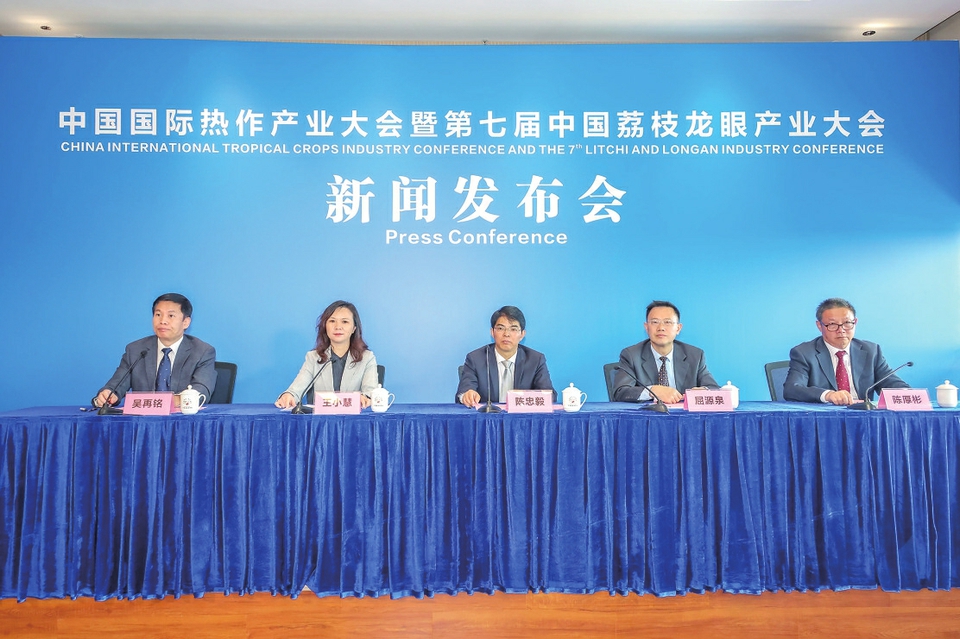 本报讯 昨日上午,中国国际热作产业大会暨第七届中国荔枝龙眼产业大会新闻发布会在茂名市中国荔枝博览馆召开。中国农垦经济发展中心(农业农村部南亚热带作物中心)副主任陈忠毅,广东省农业农村厅总畜牧兽医师屈源泉,副市长王小慧,国家荔枝龙眼产业技术体系首席科学家陈厚彬出席发布会,介绍大会有关情况并答记者问。