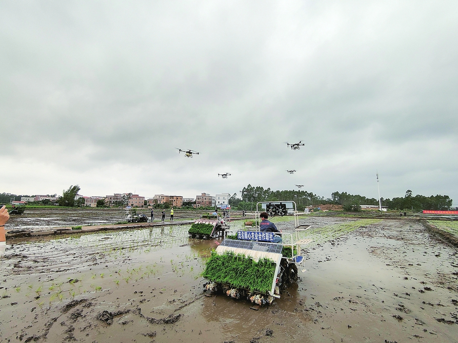 谷雨时节的一个早晨。茂南区金塘镇白土村委会杨梓榔村的田间地头,7台插秧机正在田间来回穿行,一株株秧苗迅速落地;田野上方,9台无人机在空中飞旋喷洒肥料。一幅幅美丽的春耕新图景,折射出农业高质量发展的新气质。