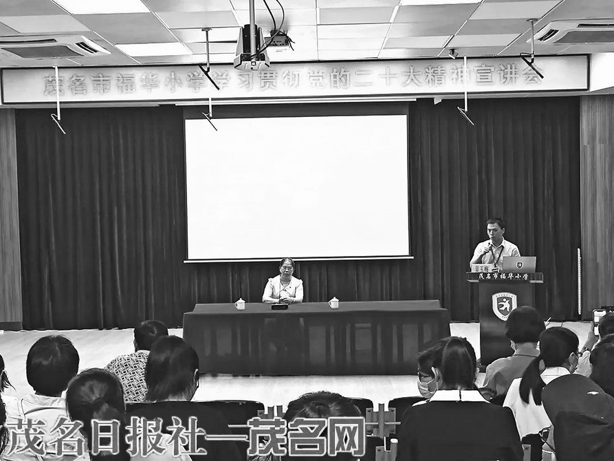 本报讯为深入推动党的二十大精神深入人心、落地生根,展现教育人矢志不渝听党话、坚定不移跟党走的精神风貌,推动党的二十大精神进校园走深走实,5月8日下午,茂名市福华小学召开学习贯彻党的二十大精神专题学习宣讲会。