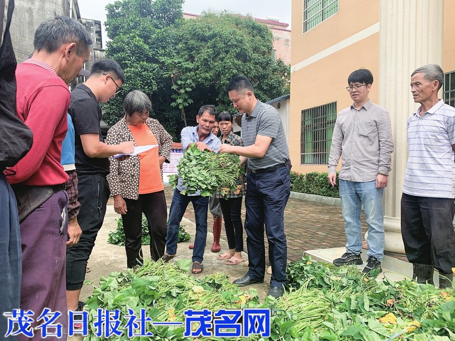 在葛山村委会办公楼前,堆放着一捆捆鲜翠嫩绿的番薯苗,村民们正有序地领取自家相应数量的番薯苗,同时,万草斋(茂名)农业有限公司负责人现场为村民授课,讲解番薯种植、提高产量的种植技巧。该公司责人介绍:“今年公司培育的番薯苗品种是‘一点红’番薯,紫皮紫心中间夹着雪白的果肉,看起来真像冰淇淋一般,又叫‘冰淇淋’番薯,它的特点是个头细长,皮薄肉实,口感香、糯、甜、滑,具有无须无筋无渣的特点,一年四季均有产出,是番薯界的‘扛把子’,亩产量达3000斤至5000斤。”