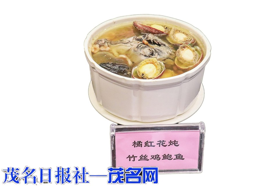 烹调法:炖主料:橘红花,竹丝鸡,鲍鱼。辅料:荔枝干,桂圆肉,麦冬,排骨。调料:精盐。