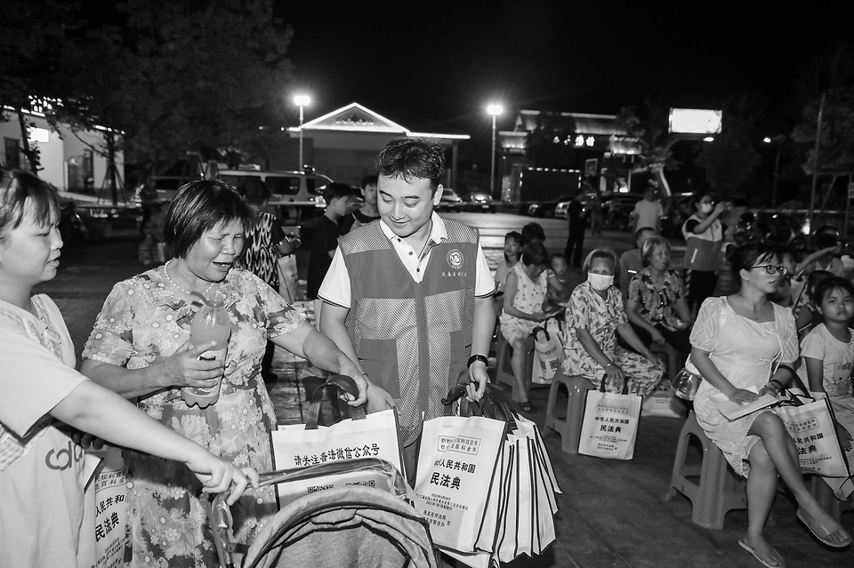 为加深群众对法律知识的理解与运用,晚会现场还穿插法律知识竞答环节,将“成年子女对父母是否负有赡养、扶助和保护义务”“夫妻双方离婚冷静期是多少天”“儿子和女儿继承权是否平等”等贯穿于节目当中的法治元素融入竞答,进一步点燃群众互动学法的热情。晚会现场共派发民法典宣传小册子、普法小礼品等约500多件,营造了浓厚的法治氛围。