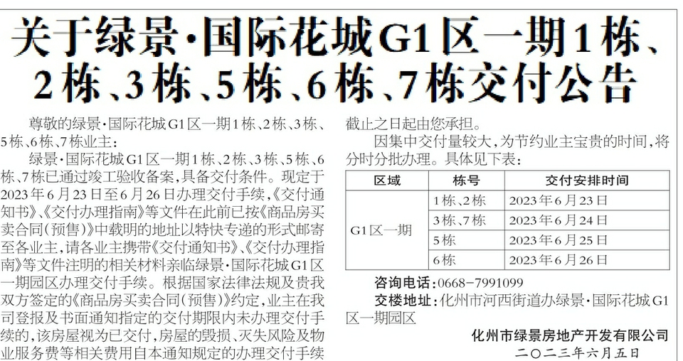 关于绿景·国际花城G1区一期1栋、2栋、3栋、5栋、6栋、7栋交付公告