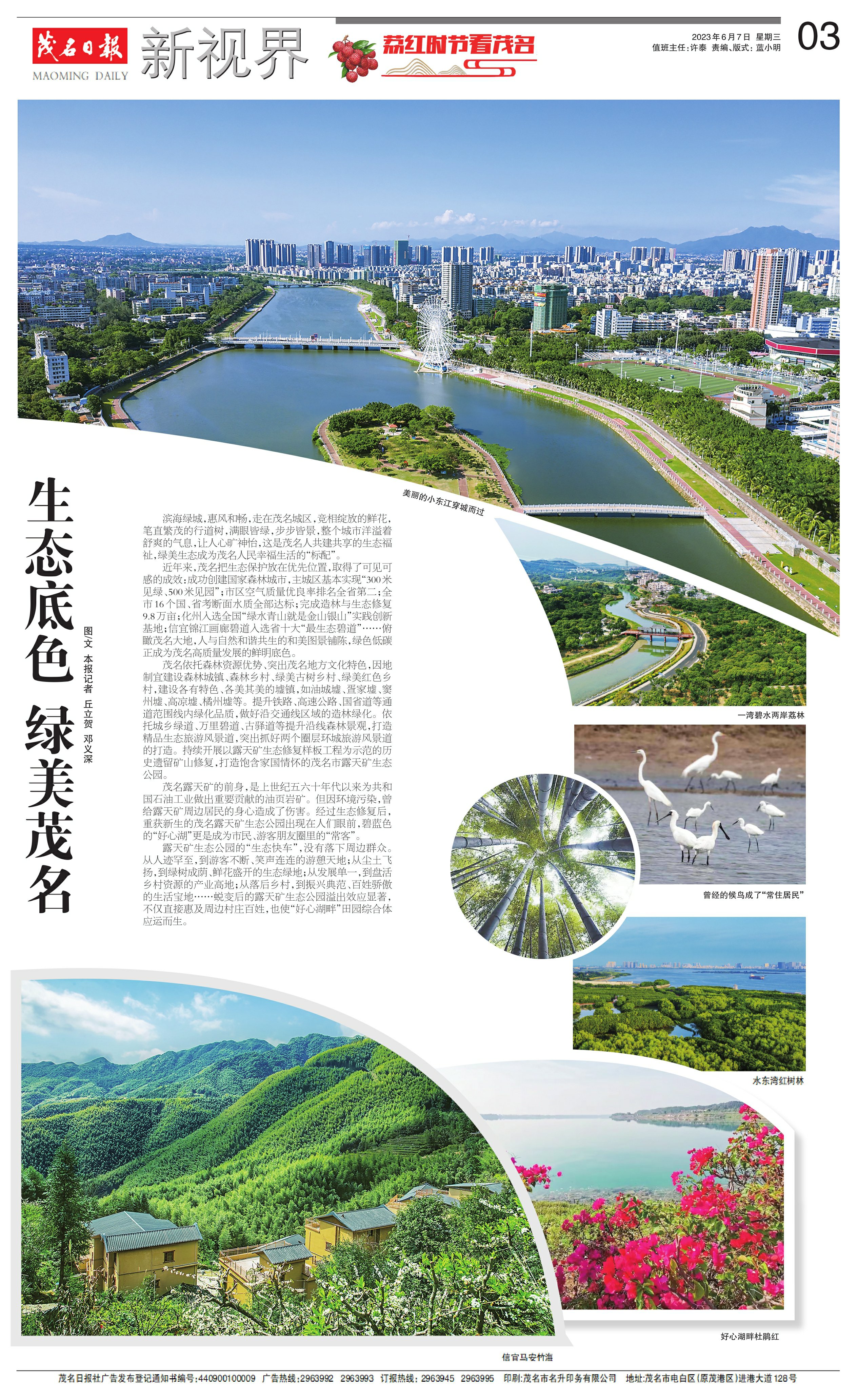 近年来,茂名把生态保护放在优先位置,取得了可见可感的成效:成功创建国家森林城市,主城区基本实现“300米见绿、500米见园”;市区空气质量优良率排名全省第二;全市16个国、省考断面水质全部达标;完成造林与生态修复9.8万亩;化州入选全国“绿水青山就是金山银山”实践创新基地;信宜锦江画廊碧道入选省十大“最生态碧道”……俯瞰茂名大地,人与自然和谐共生的和美图景铺陈,绿色低碳正成为茂名高质量发展的鲜明底色。