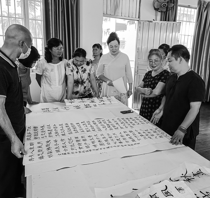 茂名市油城老年大学师生在研究参赛作品。通讯员柯丽明摄