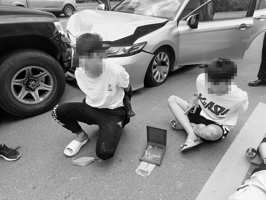 车上2名嫌疑人随即弃车逃跑,另1名嫌疑人车内束手就擒。“别跑,站住!”民警一边大声警告,一边狂奔追缉。数十名警力冒着37℃的高温,在车流不息的道路上对其穷追不舍。经过十几分钟追缉,2名嫌疑人最终被民警成功擒获,现场无群众伤亡。