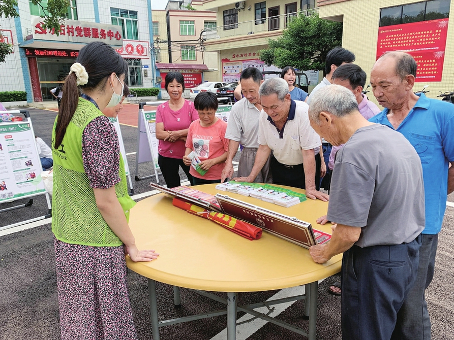 当天下午,观影前,那霍镇禁毒办在水石村委会开展禁毒知识培训。室外,禁毒社工通过悬挂横幅、摆放宣传展板、发放禁毒手册、现场讲解等方式向群众进行禁毒知识科普宣传(如右图);室内,面向广大群众、戒毒康复人员开展“应尽应帮”职业技能培训、“禁种铲毒”知识培训,普及乡村振兴战略、新农村建设及综合治理等方面知识,强化戒毒康复人员就业意识,提升职业技能。