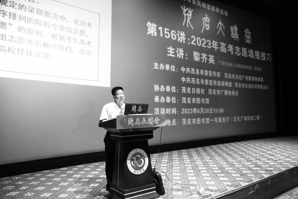 本报讯2023年普通高校招生工作即将开始,如何科学合理地填报好志愿,是目前广大家长和高中毕业生最关心的热点话题。昨天下午,由市委宣传部、市文广旅体局、市社科联联合主办,茂名日报社、市广播电视台协办的茂名大讲堂第156讲在茂名图书馆一号报告厅举行,广东石油化工学院党委常委、副教授黎齐英为大家详细解读了2023年高考志愿填报技巧(如右图,本报记者刘付思明摄)。