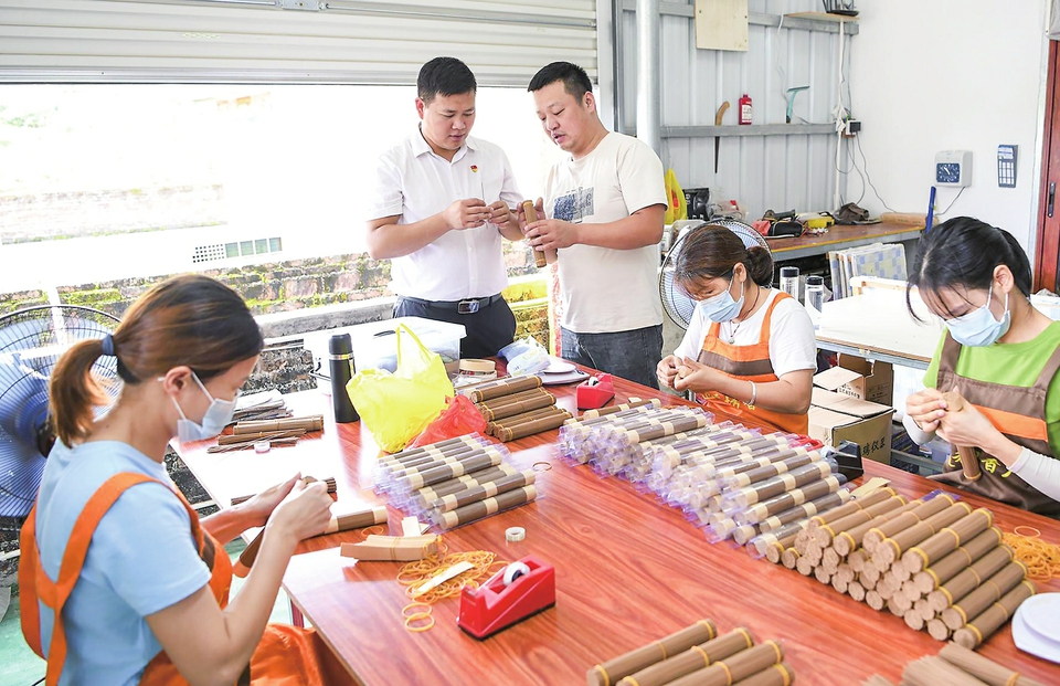 谢培君(左)在了解沉香线香生产情况。本报记者甘杨松摄