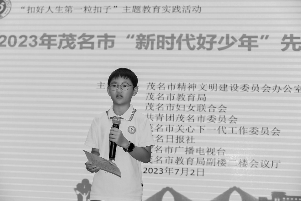 本报讯日前,由市文明办、市教育局、团市委、市妇联、市关工委共同主办的2023年茂名市“新时代好少年”发布会,在市教育局举行。经过前一阶段的推荐、评审、公示等评选程序,汪姿君等20名优秀学生获颁2023年度茂名市“新时代好少年”荣誉称号。他们或勤奋刻苦、品学兼优,或孝老爱亲、照顾家人,或热心公益、乐于助人,用实际行动展现了我市“新时代好少年”的良好精神风貌。