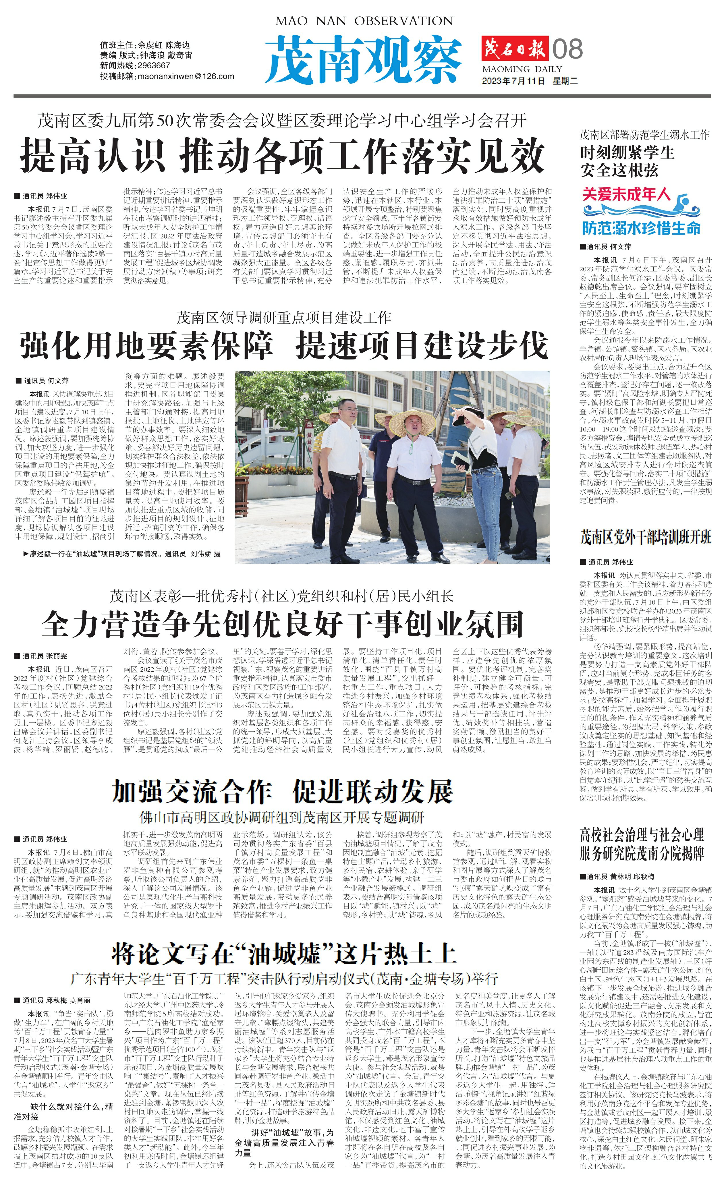 本报讯 数十名大学生到茂南区金塘镇参观,“零距离”感受油城墟带来的变化。7月7日,广东石油化工学院社会治理与社会心理服务研究院茂南分院在金塘镇揭牌,将以文化振兴为金塘高质量发展强心铸魂,助力我市“百千万工程”。