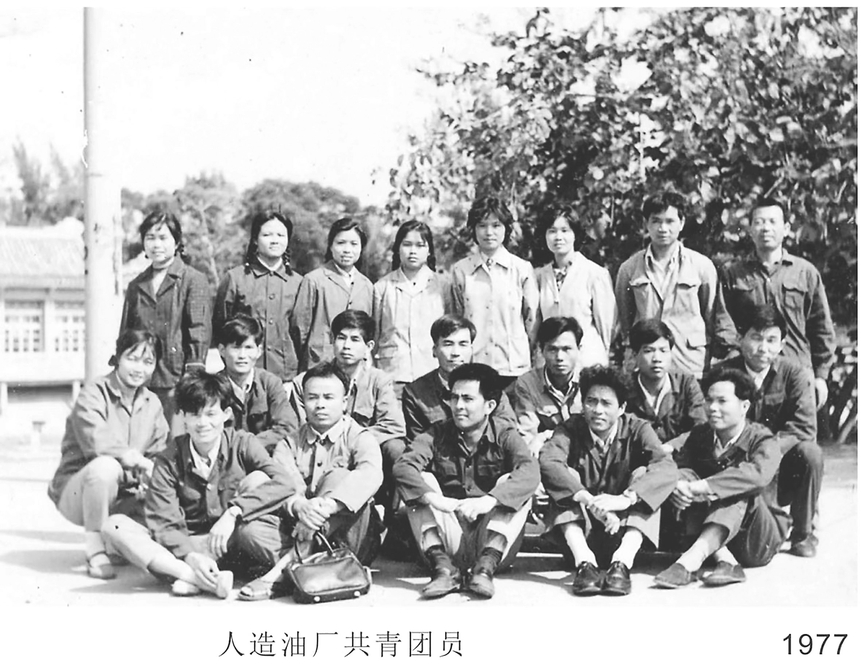 1975年4月,共青团人造油厂第一次代表大会召开,康洁任厂团委书记,笔者为团委委员。1977年初,康洁调离人造油厂,朱文超任厂团委书记,在“五四”到来前,各车间团支部评出一批优秀共青团员,那时没有奖金,没有奖品。二级工资一个月44元5角7分。到市区东北小饭馆吃早餐,一角钱可以买到一碗猪骨粥一碟粉皮卷。厂团委决定,奖励优秀共青团员喝早茶。“五四”青年节前,到市区江滨公园茶楼,二十名优秀共青团员喝早茶,有猪肉粥、粉皮卷、肉包、糕点等,总共花了十多元钱。喝早茶后,大家又到江滨公园湖边合影,用厂团委那台“海鸥”照相机拍下这张黑白照片留念。
