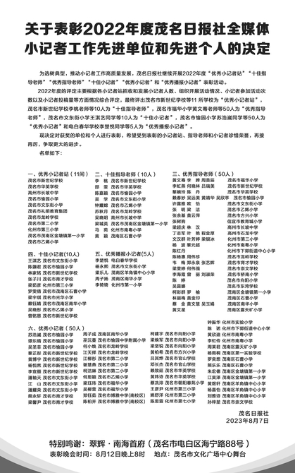 关于表彰2022年度茂名日报社全媒体小记者工作先进单位和先进个人的决定