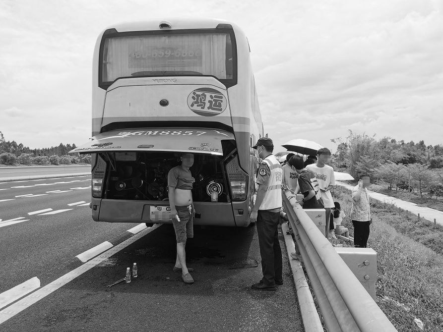 据了解,该车当天上午从湛江雷州开往广州,车上共有31名司乘人员,因发动机皮带突发故障紧急停靠上述地点,司机正在排查故障并更换零件。“车上炎热且不安全,我先带大家撤到护栏外等候,车辆估计很快就能修好,不着急。”易建东等两人分工合作引导所有乘客前往安全区等候并不断安抚其焦躁情绪,并协助司机抓紧修复故障。