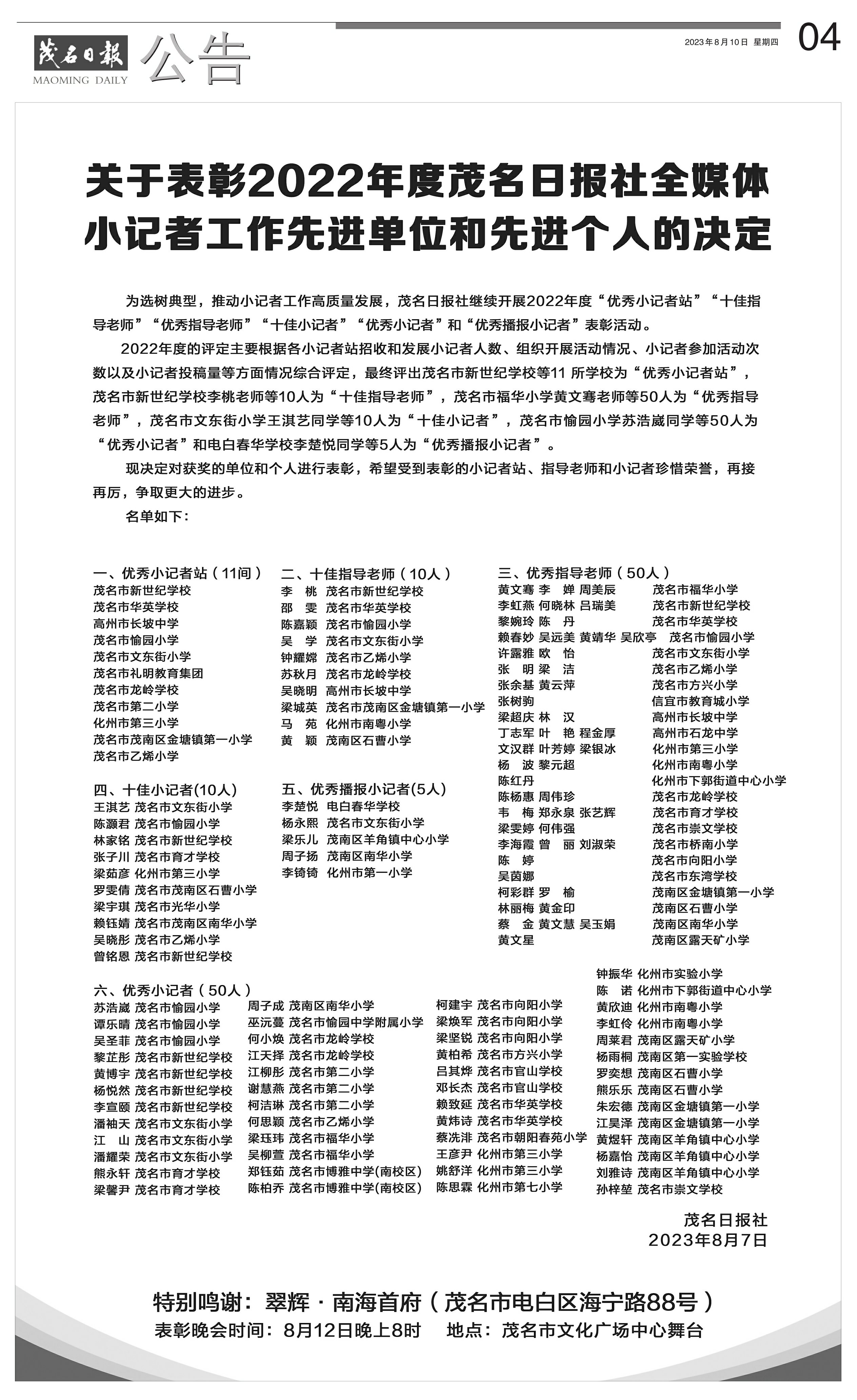 关于表彰2022年度茂名日报社全媒体小记者工作先进单位和先进个人的决定