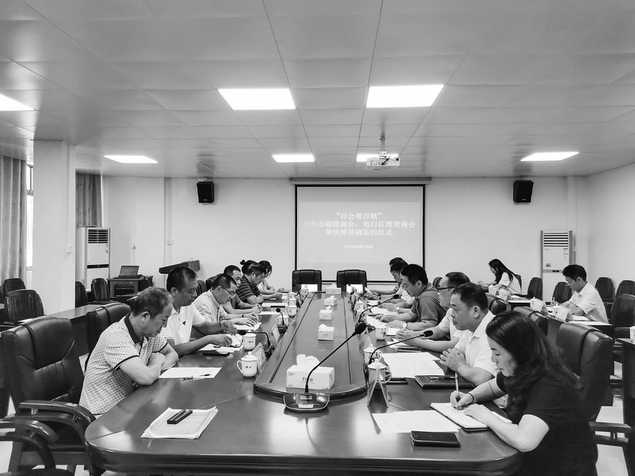 本报讯近日,茂名市福建商会、电白区博贺商会帮扶博贺镇签约仪式在滨海新区博贺镇政府举行,博贺镇主要领导以及茂名市福建商会、电白区博贺商会代表共20余人见证签约(如上图)。