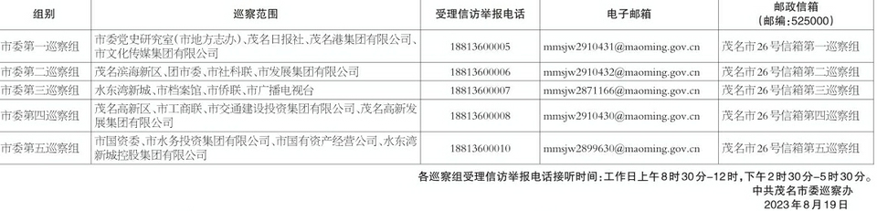 根据市委巡察工作统一部署,市委巡察组于2023年8月中旬至2023年12月中旬对茂名滨海新区、茂名高新区、水东湾新城、市委党史研究室(市地方志办)、市档案馆、市国资委、市工商联、团市委、市社科联、市侨联、茂名日报社、市广播电视台、市发展集团有限公司、市交通建设投资集团有限公司、市水务投资集团有限公司、市国有资产经营公司、茂名港集团有限公司、市文化传媒集团有限公司、水东湾新城控股集团有限公司、茂名高新发展集团有限公司等20个单位党组织开展巡察。