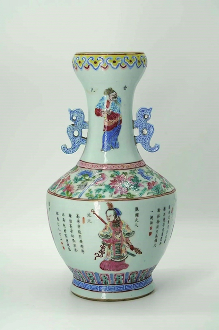 粉彩无双谱人物诗文双螭耳蒜头瓶。