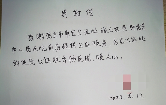 本报讯近日,茂名市南宏公证处为市民徐婆婆及其女儿黄女士开通办证绿色通道,提供上门公证服务,切实解决了他们的大难题。当事人为此专门给南宏公证处送上感谢信,感谢公证处“解民忧,暖人心”。