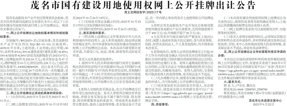 茂名市国有建设用地使用权网上公开挂牌出让公告