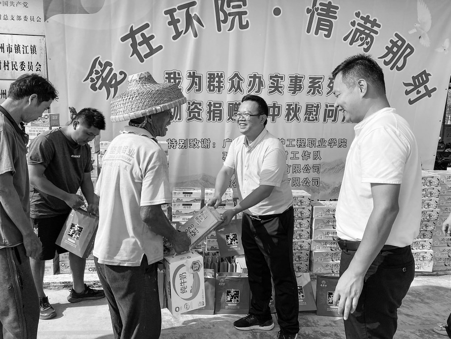 本报讯昨日,广东省驻高州市镇江镇驻镇帮镇扶村工作队队员趁着中秋佳节将至,与广东环境保护工程职业学院在镇江镇那射村举行“爱在环院情满那射”我为群众办实事系列活动之物资捐赠暨中秋慰问活动。工作队全体队员、广东环境保护工程职业学院派驻那射村第一书记以及村干部一起慰问了该村原建档立卡脱贫户、低保户、五保户,获得村民一致好评。