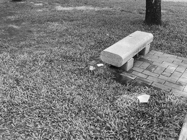 石凳边,有人把休息时用过的纸巾随手丢在草地上。