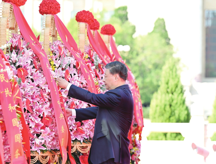 9月30日上午,党和国家领导人习近平、李强、赵乐际、王沪宁、蔡奇、丁薛祥、李希、韩正等来到北京天安门广场,出席烈士纪念日向人民英雄敬献花篮仪式。这是习近平整理花篮上的缎带。 新华社记者殷博古摄