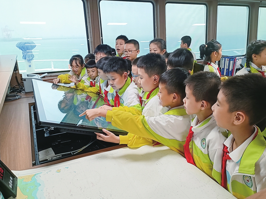 学生们体验如何使用电子海图。本报记者周燕红摄