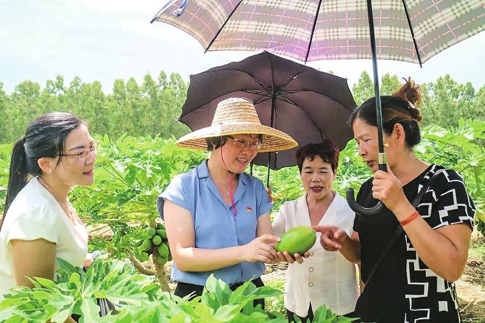 潘卓萍(左二)实地调研申请妇女创业小额担保贴息贷款的妇女群众创业情况。