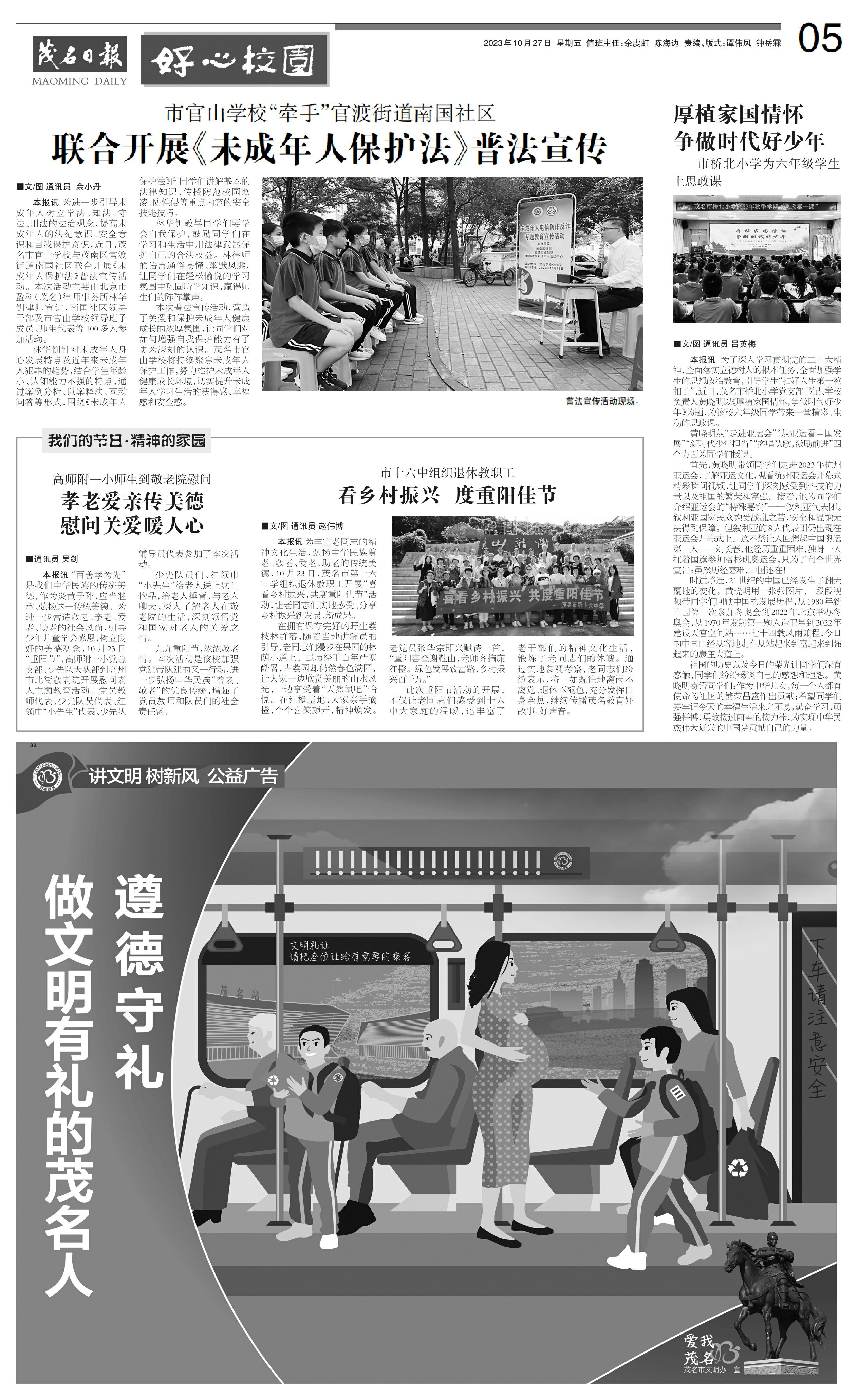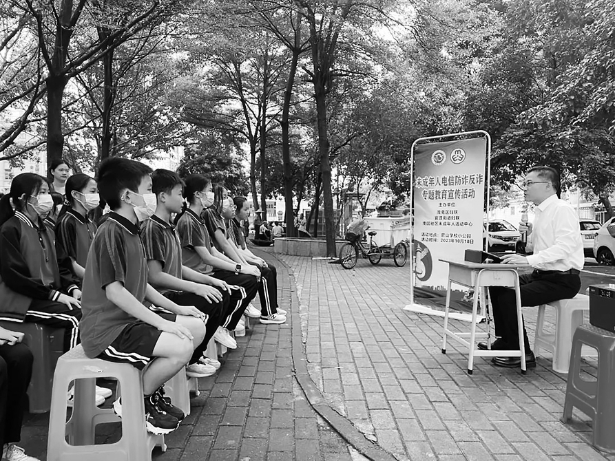 本报讯为进一步引导未成年人树立学法、知法、守法、用法的法治观念,提高未成年人的法纪意识、安全意识和自我保护意识,近日,茂名市官山学校与茂南区官渡街道南国社区联合开展《未成年人保护法》普法宣传活动。本次活动主要由北京市盈科(茂名)律师事务所林华钏律师宣讲,南国社区领导干部及市官山学校领导班子成员、师生代表等100多人参加活动。