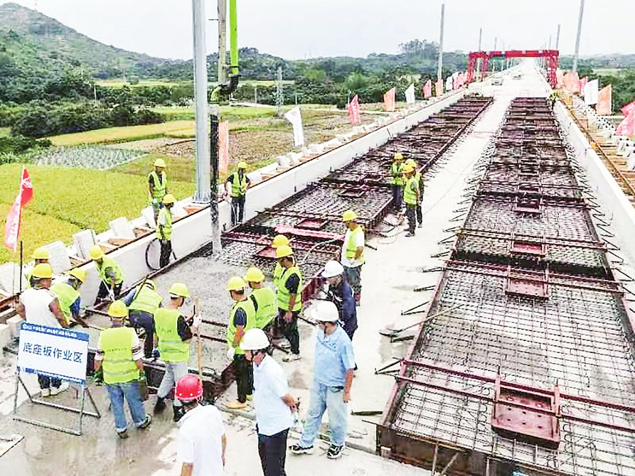 本报讯前日下午,位于电白区林头镇郭屋村1#特大桥DK320+050.75~DK320+116.15 里程段中铁七局GZZQ-8标无砟轨道首件开始浇筑混凝土。这标志着项目部无砟轨道已经进入实质性施工阶段,同时也意味着中铁七局GZZQ-8标成为广湛铁路项目全线首家正式开始无砟轨道工程施工的标段。