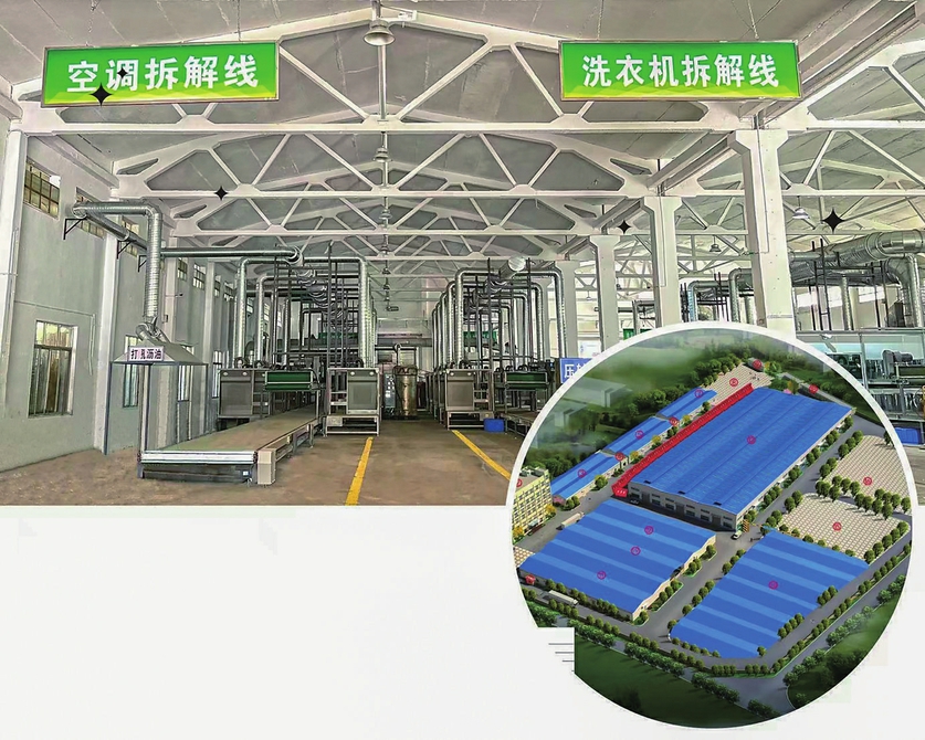 ▲废弃电器电子产品分拆车间。▶茂名天保再生资源发展有限公司鸟瞰效果图。