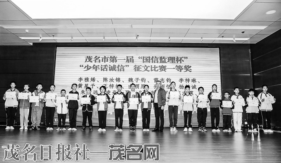 本报讯 11月18日,市发展和改革局、市教育局在市区联合举办颁奖典礼,对茂名市第一届“国信监理杯”“少年话诚信”征文比赛活动进行总结和表彰,并现场为获得一等奖的学生和优秀指导老师颁发奖状、奖品(如图茂名日报社全媒体记者 岑稳 摄)。