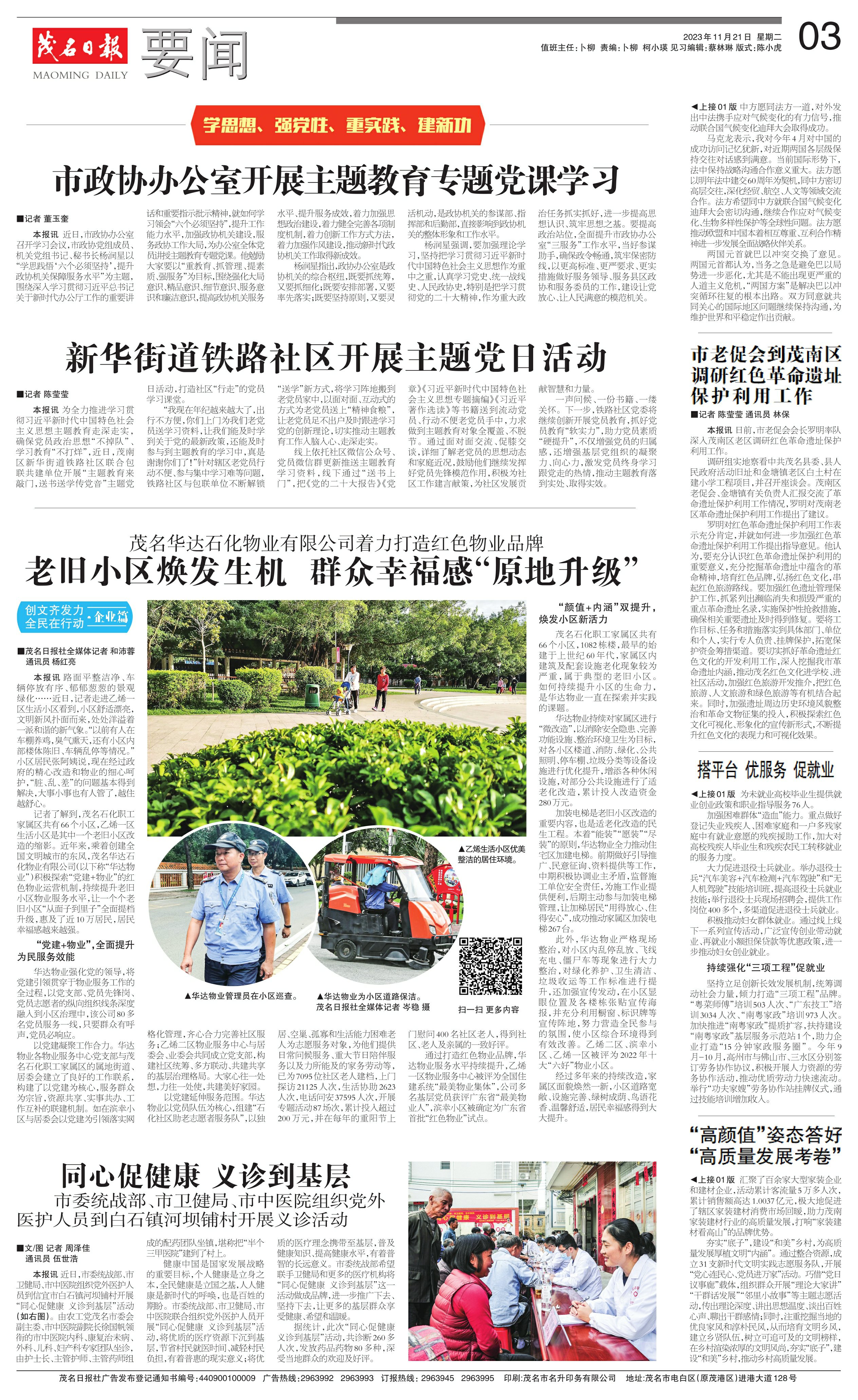 本报讯近日,市政协办公室召开学习会议,市政协党组成员、机关党组书记、秘书长杨润星以“学思践悟‘六个必须坚持’,提升政协机关保障服务水平”为主题,围绕深入学习贯彻习近平总书记关于新时代办公厅工作的重要讲话和重要指示批示精神,就如何学习领会“六个必须坚持”,提升工作能力水平,加强政协机关建设,服务政协工作大局,为办公室全体党员讲授主题教育专题党课。他勉励大家要以“重教育、抓管理、提素质、强服务”为目标,围绕强化大局意识、精品意识、细节意识、服务意识和廉洁意识,提高政协机关服务水平、提升服务成效,着力加强思想政治建设,着力健全完善各项制度机制,着力创新工作方式方法,着力加强作风建设,推动新时代政协机关工作取得新成效。