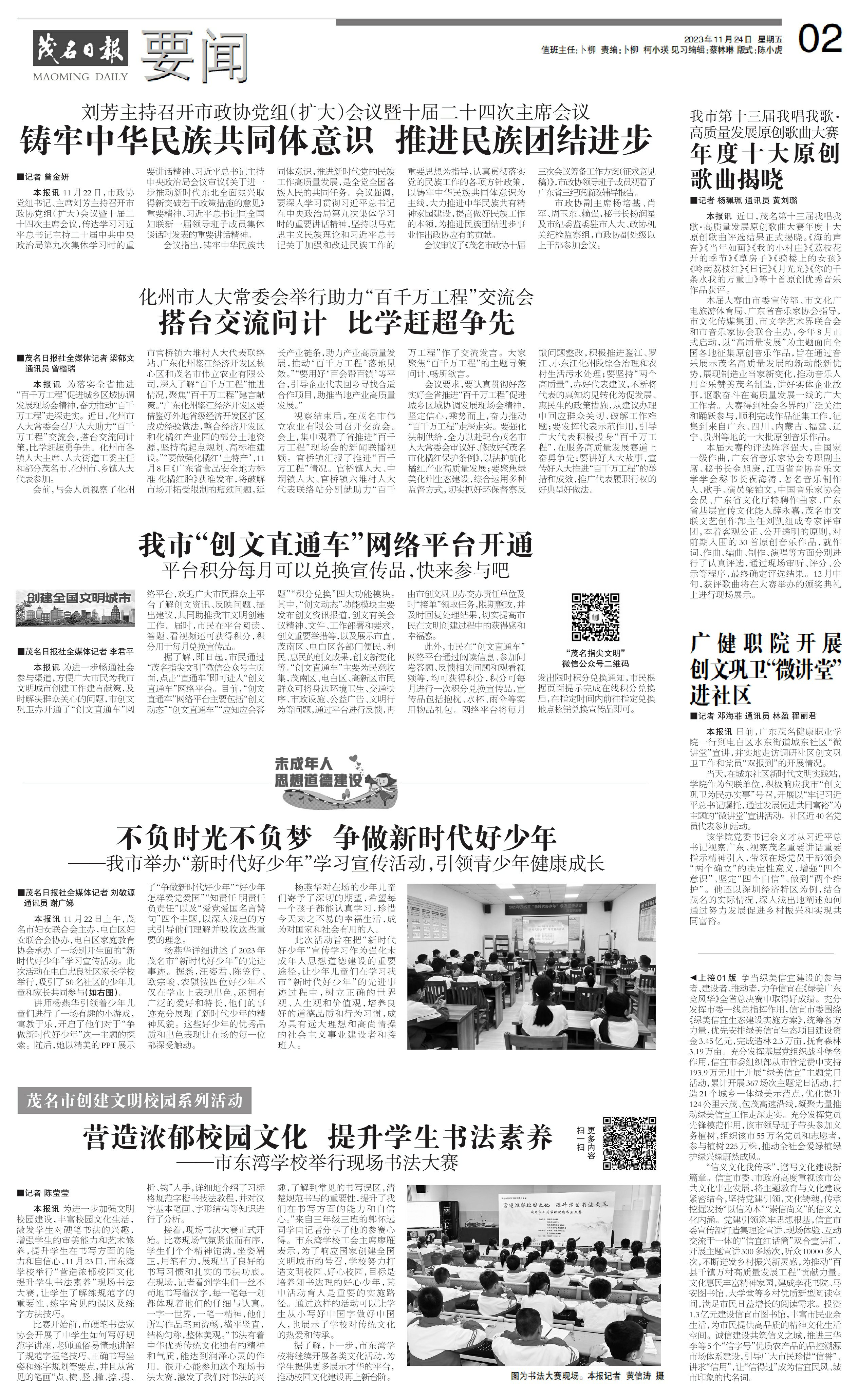 本报讯11月22日上午,茂名市妇女联合会主办,电白区妇女联合会协办,电白区家庭教育协会承办了一场别开生面的“新时代好少年”学习宣传活动。此次活动在电白忠良社区家长学校举行,吸引了50名社区的少年儿童和家长共同参与(如右图)。