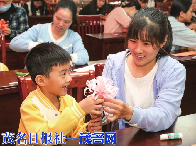 家长和孩子体验制作手工花的乐趣。茂名日报社全媒体记者李颜东摄