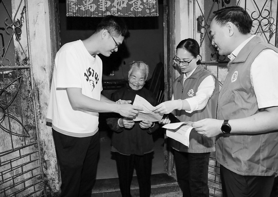 志愿者入户派发宣传单页。茂名日报社全媒体记者李颜东摄