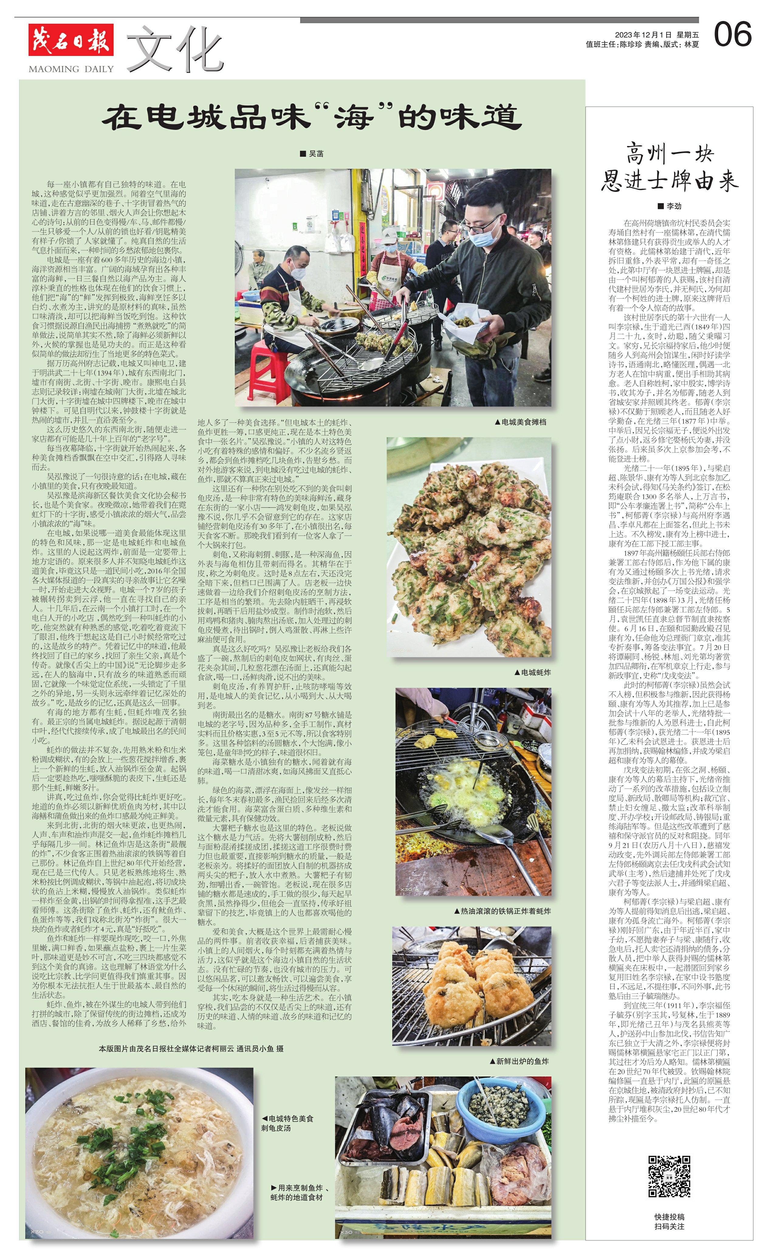 蚝炸、鱼炸,被在外谋生的电城人带到他们打拼的城市,除了保留传统的街边摊档,还成为酒店、餐馆的佳肴,为故乡人稀释了乡愁,给外地人多了一种美食选择。“但电城本土的蚝炸、鱼炸更胜一筹,口感更纯正,现在是本土特色美食中一张名片。”吴泓豫说。“小镇的人对这特色小吃有着特殊的感情和偏好。不少名流乡贤返乡,都会到鱼炸摊档吃几块鱼炸,告慰乡愁。而对外地游客来说,到电城没有吃过电城的蚝炸、鱼炸,那就不算真正来过电城。”