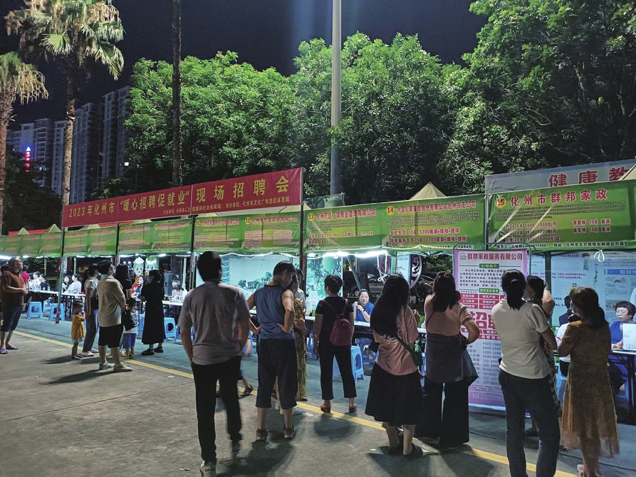 巧用广场烟火气,群众求职更开心。化州“人才夜市”设在该市康景体育馆南门广场、万达广场等热闹的公共场所或夜市区,避开了日间高温天气和繁忙时段,巧用广场烟火气,将年轻人喜闻乐见的夜生活场景与求职招聘服务相融合,将纳凉地变为纳贤场,让招聘企业“摆摊”亮岗,高校毕业生、返乡农民工“逛个街”就能找到工作了(如右图)。“本来是来玩的,发现这边在办招聘会,就来看看有没有适合自己的。”求职者李小姐说,自己是应届高校毕业生,正在找工作。“看了一下,发现有很多不错的岗位,有了初步意向。”
