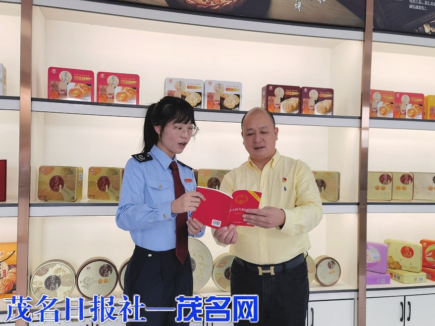 图为该局青年干部走进广东金芝香饼业有限公司开展宪法宣传活动,为纳税人介绍宪法和各项税费支持政策,培养群众法治意识,增强税法遵从度。通讯员区晓波摄影报道