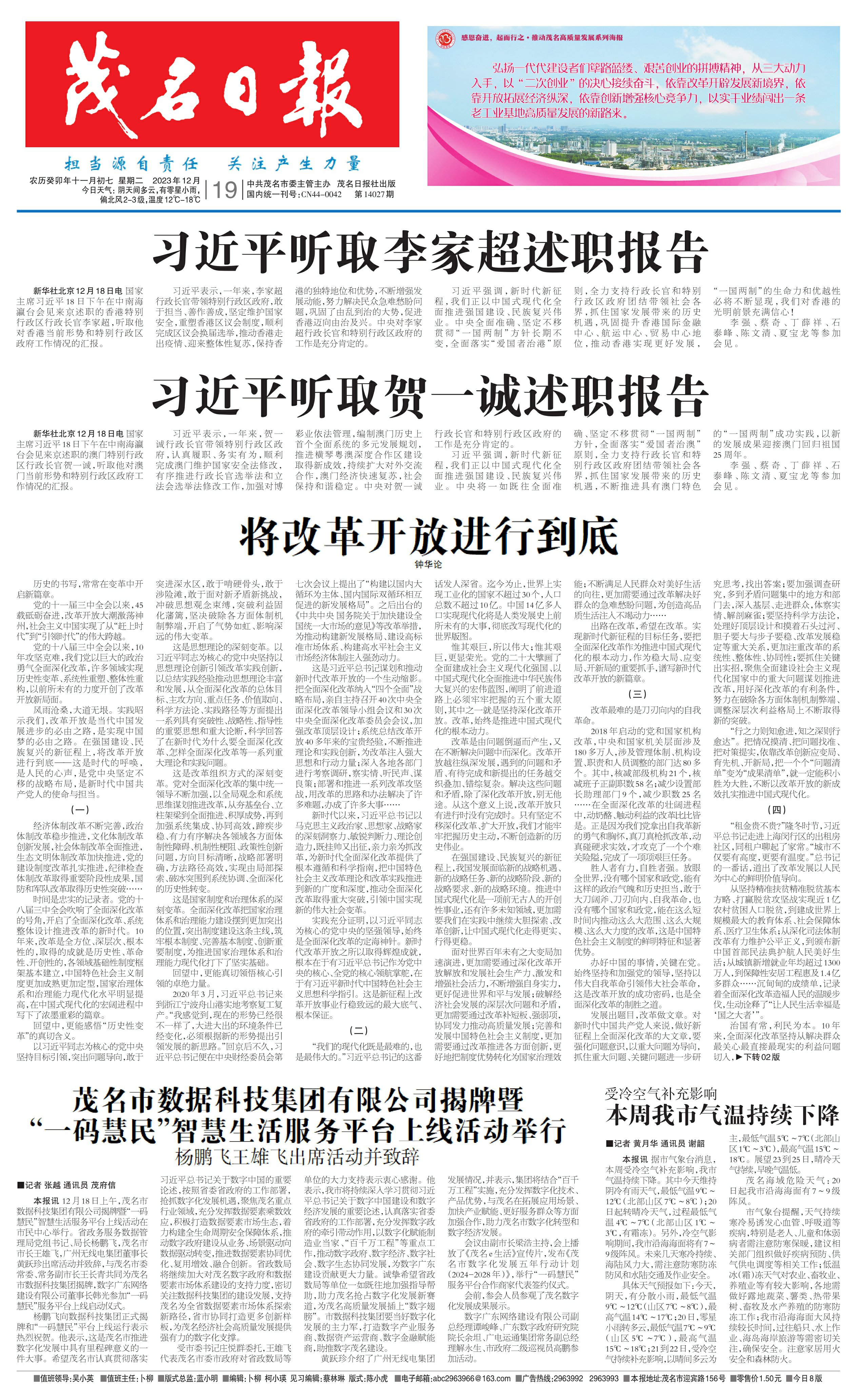 本报讯12月18日上午,茂名市数据科技集团有限公司揭牌暨“一码慧民”智慧生活服务平台上线活动在市民中心举行。省政务服务数据管理局党组书记、局长杨鹏飞,茂名市市长王雄飞,广州无线电集团董事长黄跃珍出席活动并致辞,与茂名市委常委、常务副市长王长青共同为茂名市数据科技集团揭牌,数字广东网络建设有限公司董事长韩光参加“一码慧民”服务平台上线启动仪式。