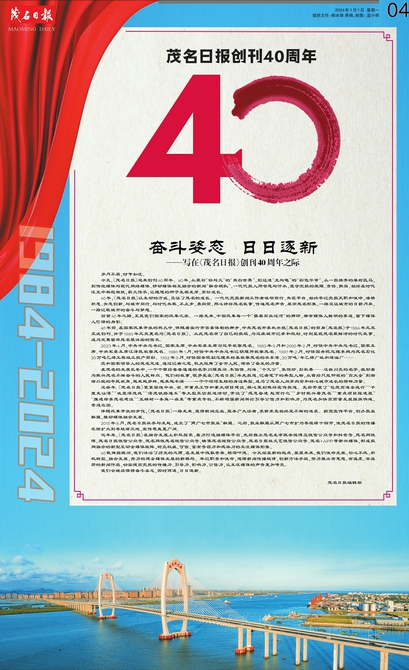 40年前,在国家改革开放的热火中,伴随着实行市管县体制的脚步,中共茂名市委机关报《茂名日报》的前身《茂名报》于1984年元旦正式创刊,并于1985年元旦更名为《茂名日报》。从此茂名有了自己的报纸,为这座城市记录和鼓劲,时刻呈现茂名最鲜活的时代故事,成为完整留存茂名最详实的信史。
