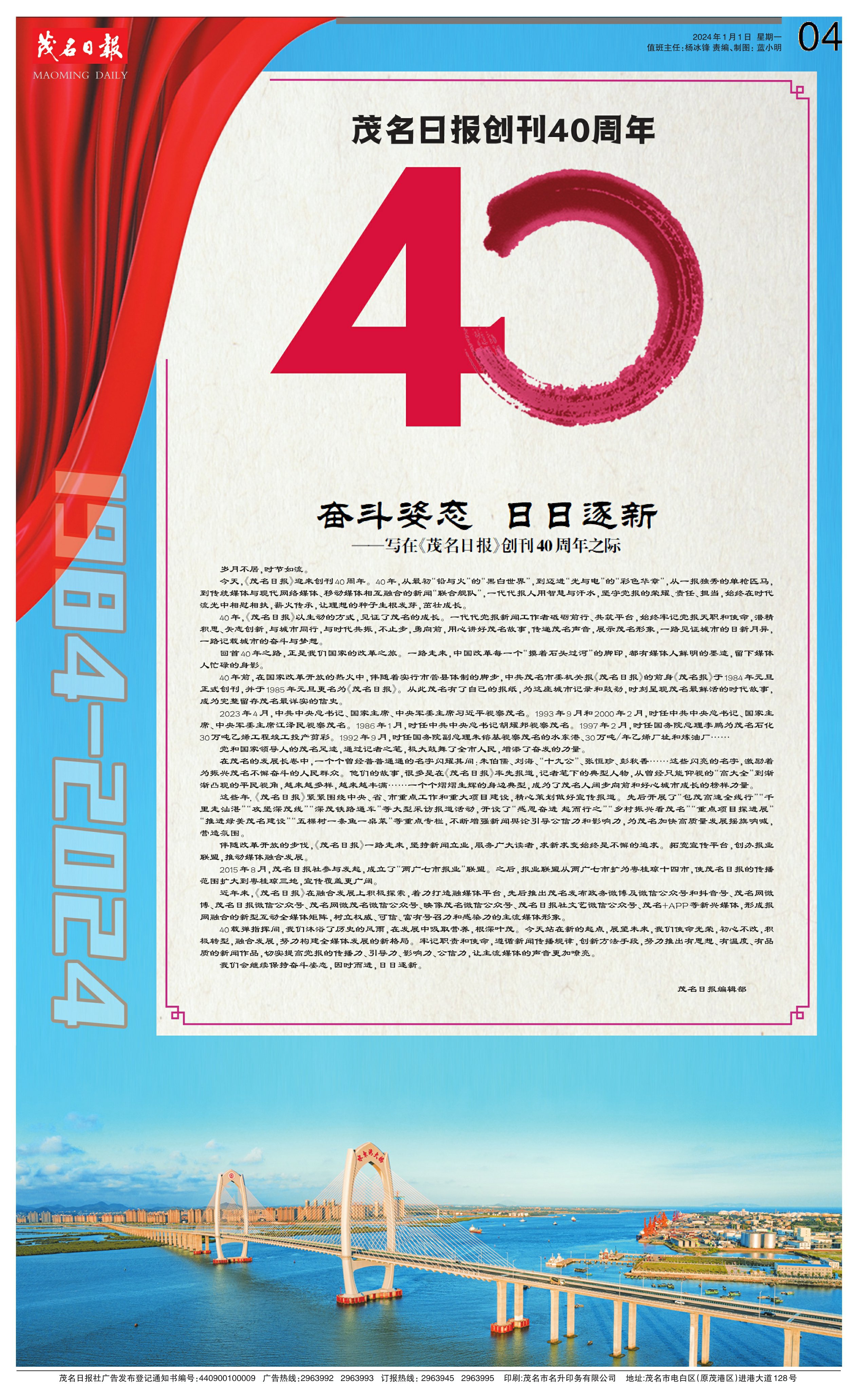 40年,《茂名日报》以生动的方式,见证了茂名的成长。一代代党报新闻工作者砥砺前行、共筑平台,始终牢记党报天职和使命,潜精积思、矢志创新,与城市同行,与时代共振,不止步,勇向前,用心讲好茂名故事,传递茂名声音,展示茂名形象,一路见证城市的日新月异,一路记载城市的奋斗与梦想。