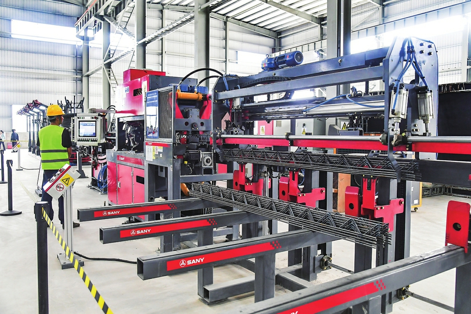 映入眼帘的是一片繁忙的生产场景,厂房和生产线已经初具规模,猪肉制品加工项目为农业产业链的延伸提供了有力支撑;智能化的建筑构件生产线正在高效运转,工人们忙碌地操作着先进的机器设备,进行着钢筋加工、混凝土预制等作业,呈现出现代化、智能化的特点,展示了在建筑工业智造领域的领先水平。